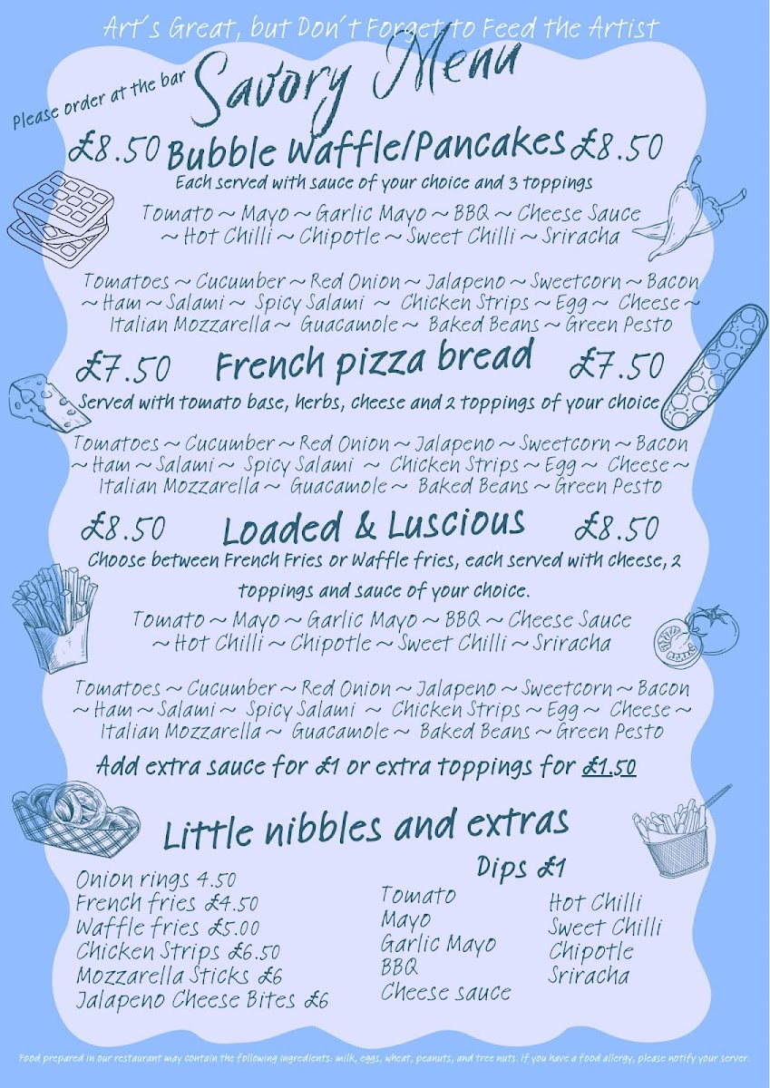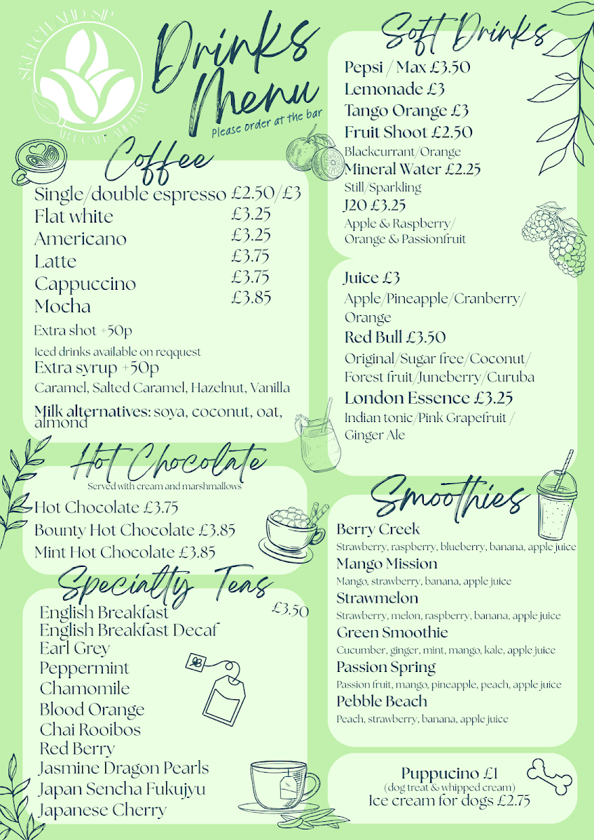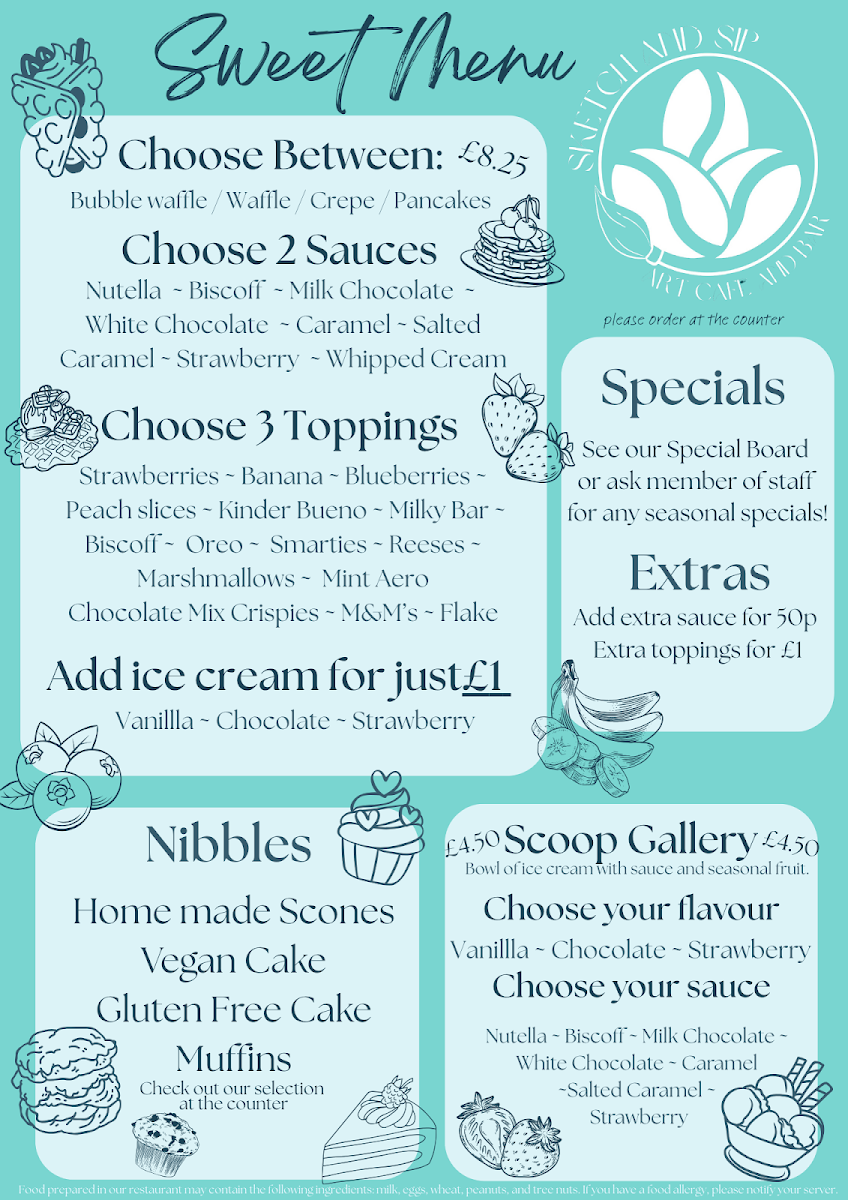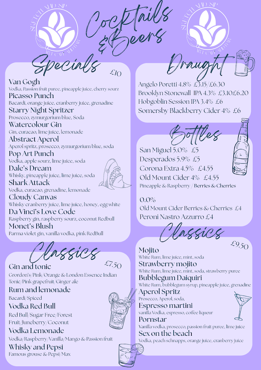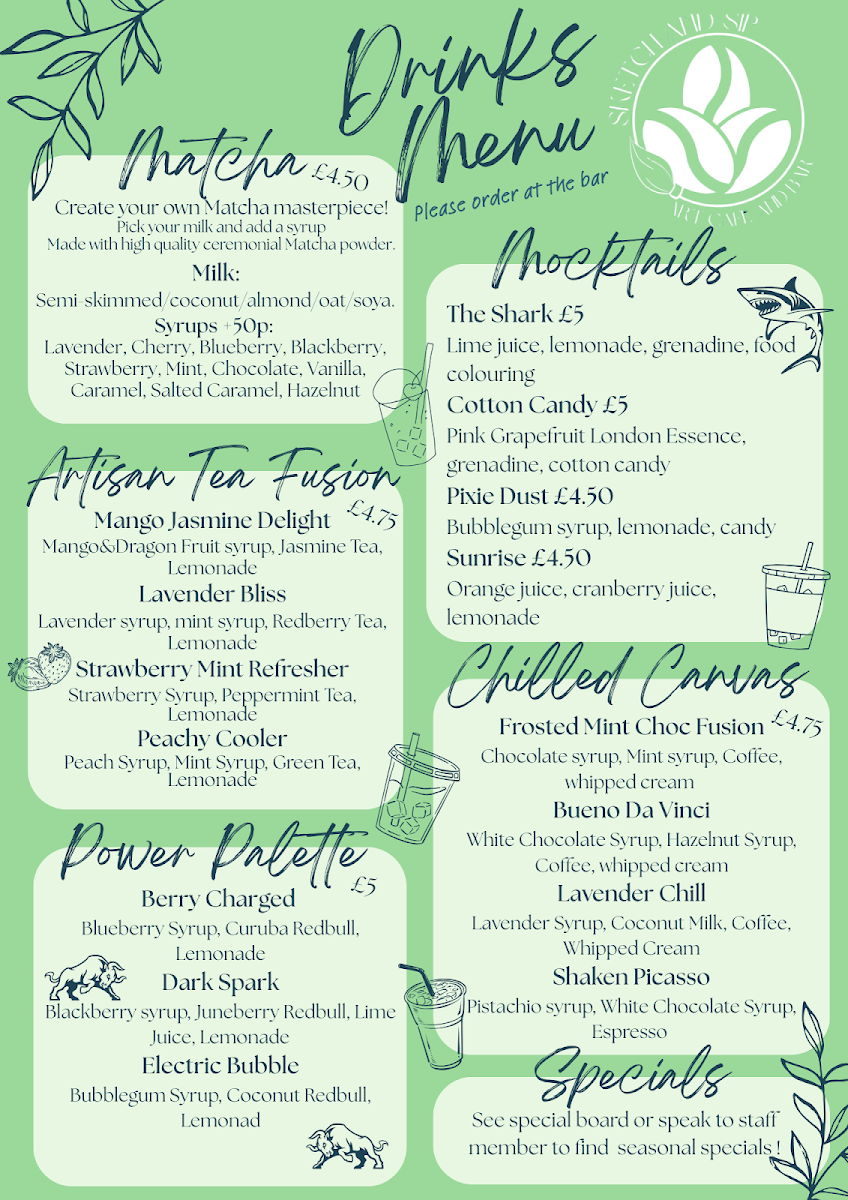 The menu at Sketch and Sip offers a selection of drinks and light food items suitable for casual visits throughout the day, including coffee breaks and light meals. The offerings are organized into clear sections to facilitate easy choice.