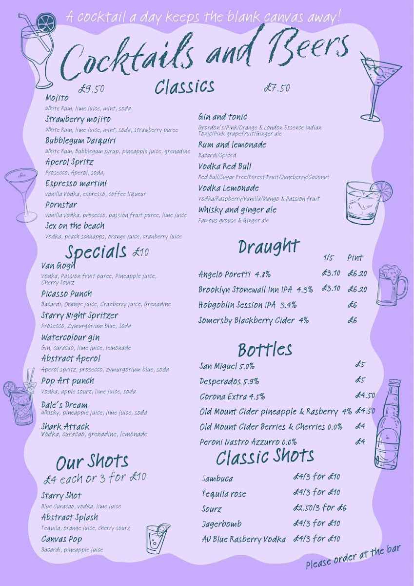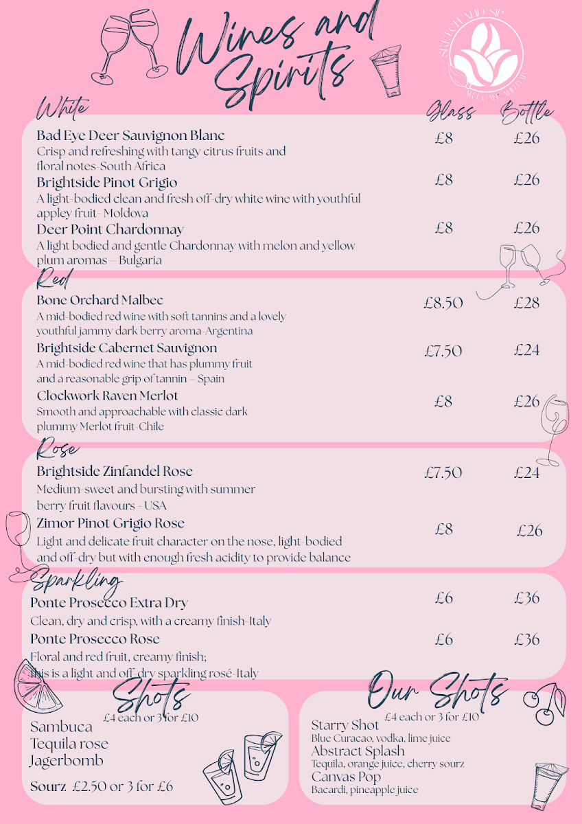 Drinks include a variety of classic cocktails such as Mojito, Strawberry Mojito, Bubblegum Daiquiri, Aperol Spritz, Espresso Martini, Sex On The Beach, Gin and Tonic, Rum and Lemonade, Vodka Red Bull, Vodka Lemonade, and Whisky and Ginger Ale. Additionally, there are a couple of rosé wine options available, including Brightside Zinfandel Rosé and Zimor Pinot Grigio Rosé.