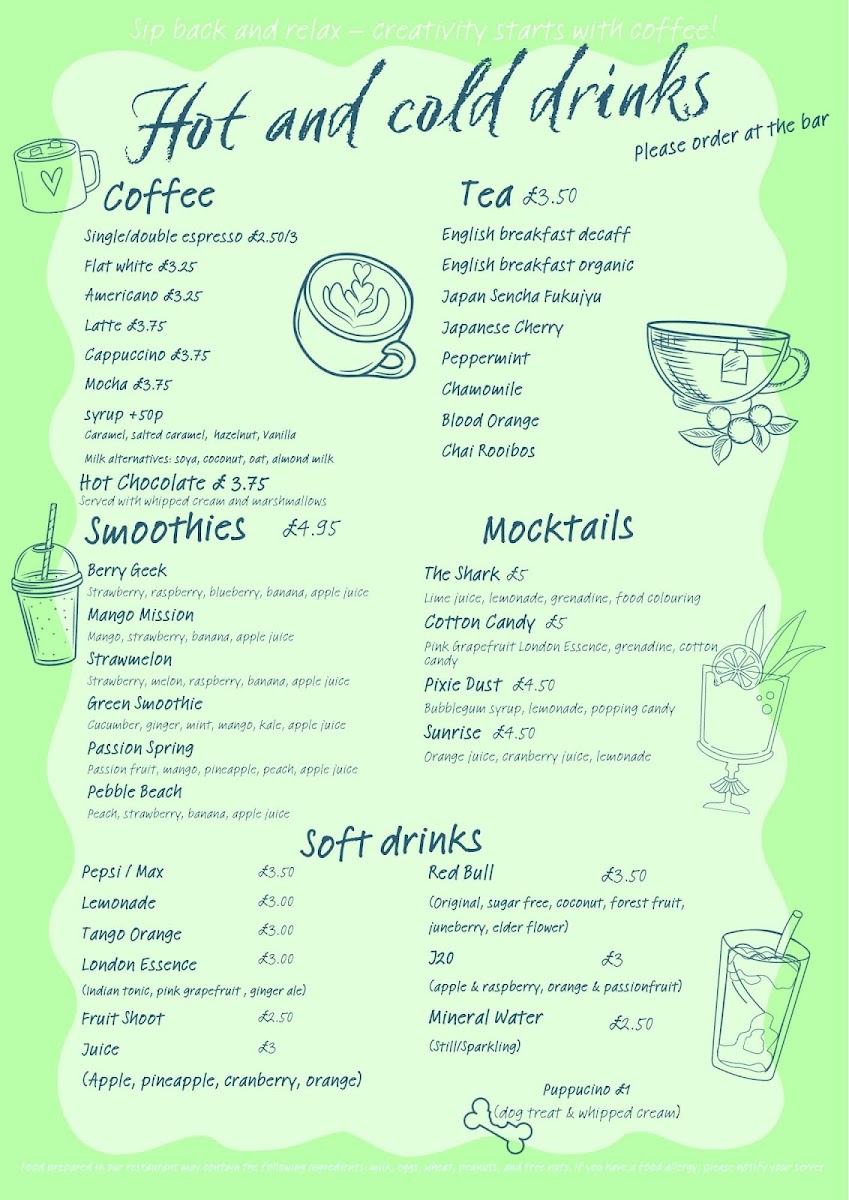 The menu layout supports a range of dining preferences, from quick orders to relaxed snacking, with a focus on beverages accompanied by light bites. This structure helps visitors select items efficiently depending on their time and appetite.